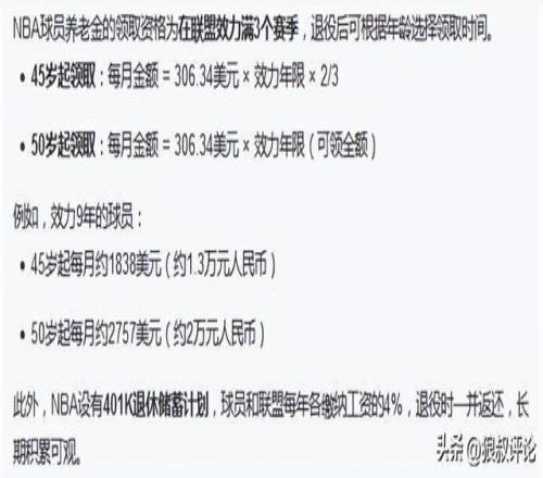 根据NBA规则,打满3年就可以领取最低标准,职业生涯超过10年就可以按最高标准拿退休金。并且这笔钱是以“年金”的方式进行计算与发放的,非“按月发放”的形式。