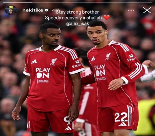 在利物浦前锋伊萨克受伤后,他的队友埃基蒂克在社交媒体上发文祝他早日康复。