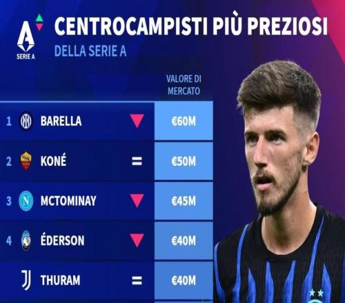 德转意甲中场身价前10:巴雷拉6000万第1,科内,小麦二三位 -